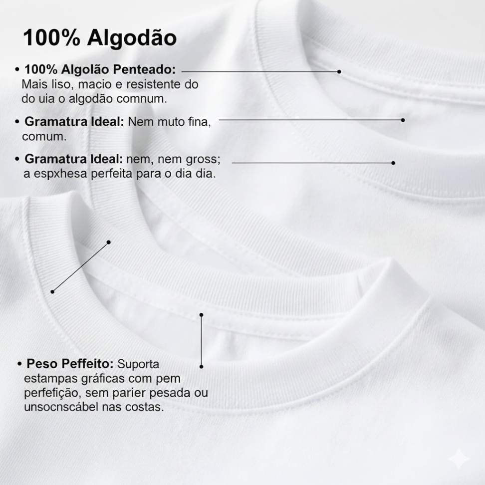 Base Perfeita para Estampas: A superfície uniforme do algodão penteado permite que as artes gráficas tenham maior definição e durabilidade, sem rachar ou desbotar precocemente.